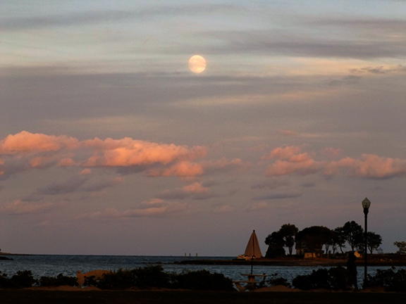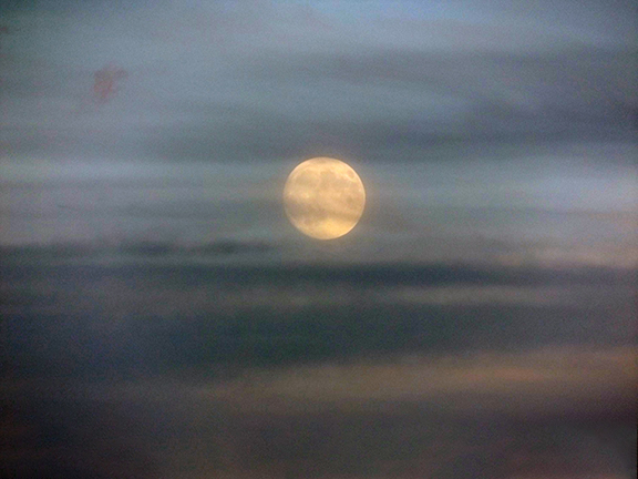 The conditions were perfect that night for a double treat from Mother Nature: a colorful textured sunset, followed by the full moon rising with the sunset’s afterglow in the background.