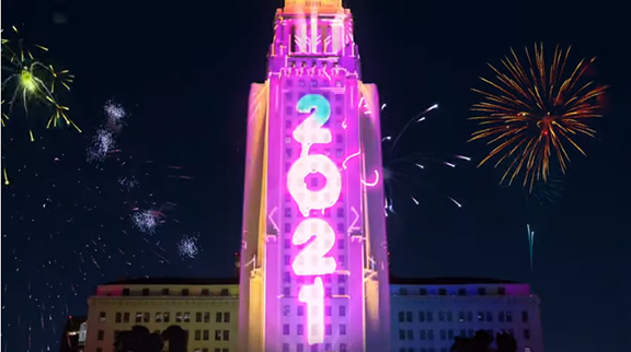 Los Angeles rang in 2021 last night with a festive celebration, minus a live audience, at Grand Park in Los Angeles. The one-hour, forty-five-minute show called “NYELA” features music from popular local artists, comments from Los Angeles County residents, and a grand countdown to 2021.