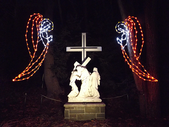 Other light displays include snowflakes, decorated trees, animals, a star path, and a powerful sculpture showing Jesus carrying the cross before His crucifixion.