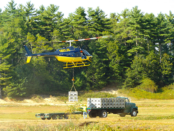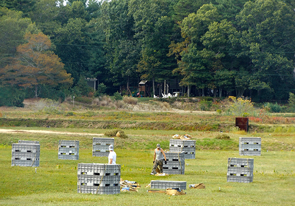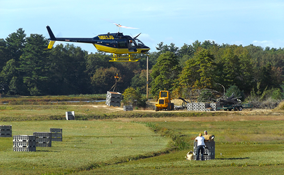 I stopped at the farm during a drive to Cape Cod and watched workers prepare containers of cranberries to be transported for processing. A stack of containers, locked together, are hooked up to a helicopter, which carries the containers to a flatbed truck and lowers them onto the bed while workers guide the pilot.