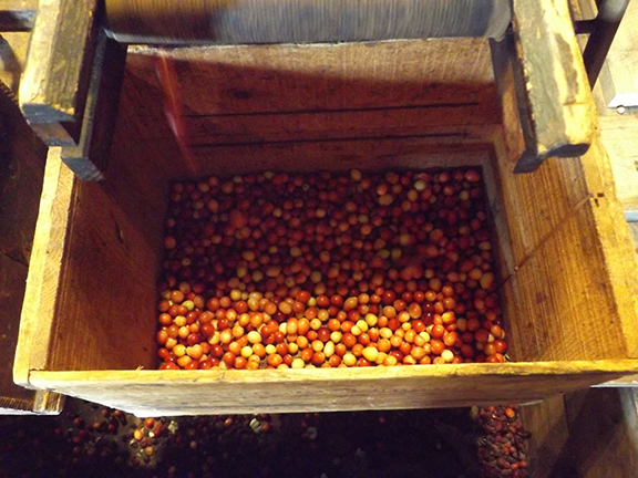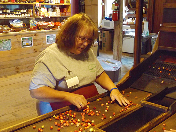 The sorter stands at the machine and picks out any berries that are damaged or are too small to process but didn’t fall through the mesh. The sorter drops the rejected berries into the bin under the machine.