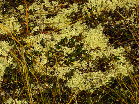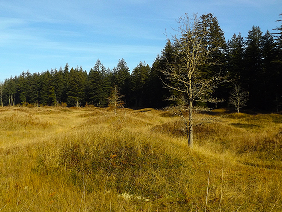 The mound heights range from one to seven feet, and the widths are from eight to 40 feet. The landscape reminds me of a the bumps on a sheet of bubble wrap laid flat, except the bumps are covered in grass and occasionally support a tree or two. Lichen grows in patches along the trail.