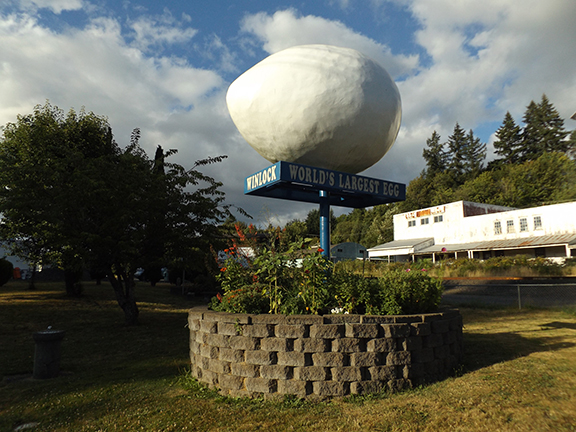 In the small town of Winlock, south of Olympia, Washington, a giant egg rests on a pedestal on a 10-foot-tall blue metal pole in the middle of Vern Zander Memorial Park at the corner of Old Highway 603 and Fir Street. The 12-foot-long, 1,200-pound marvel was funded in 1991 by local chicken hatcheryman and Lions Club member Vern Zander, a poultryman and community promoter who helped put Winlock on the map as The Egg Capital of the World . After he died in 1993, the Lions Club named the park after him.