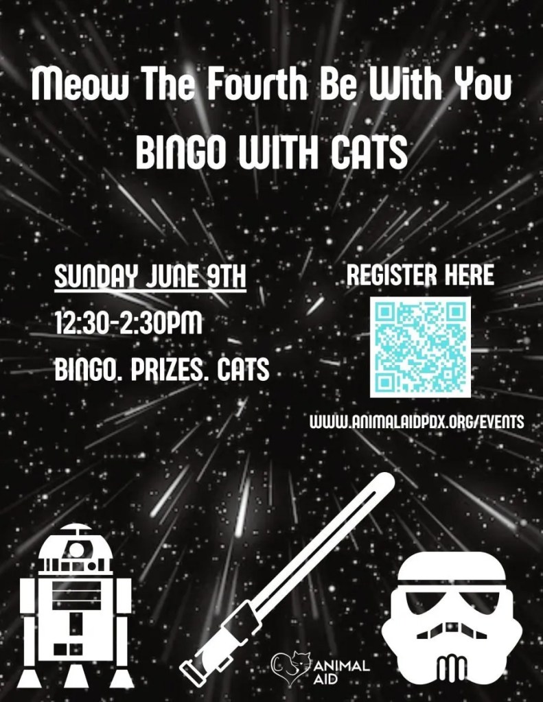 Calling all Star Wars fans! Celebrate all things Star Wars while playing bingo and hanging out with the shelter cats in Animal Aid’s free roaming room on Sunday, June 9, from 12:30 until 2:30 p.m.
